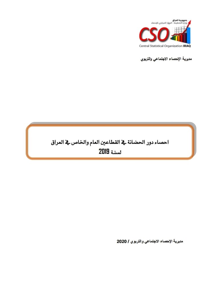 تعتبر دور الحضانة من المؤسسات المهمة بالنظر لما تقدمه من رعاية واهتمام لفئات الاطفال بعمر (0-4) سنة وخاصة الذين تشتغل امهاتهم في العمل مما يوفر الفرص لمساهمة الام في الحياة الاقتصادية والاجتماعية وعلى الرغم من الحضانات ترعى الاطفال لهذه الفئة العمرية الا ان واقع الحال يشير الى وجود اطفال باعمار اكبر ويتركز ذلك في الغالب في حضانات اجهزة الدولة والقطاع الخاص وقد حرص الجهاز المركزي للاحصاء على نشر هذه البيانات في القطاعين العام والخاص لعرض نشاط هذه المؤسسات ولاظهار اهميتها في المجتمع .